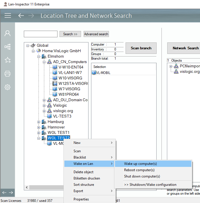 The wake-up call of a computer or a remote shutdown can both be triggered by the scan-engine during a scan process. The reboot of a computer or all members of a group in the location tree can only be executed via the context menu of the location tree. Rebooting a computer during a scan, makes no sense, therefore it is something you can only do manually.